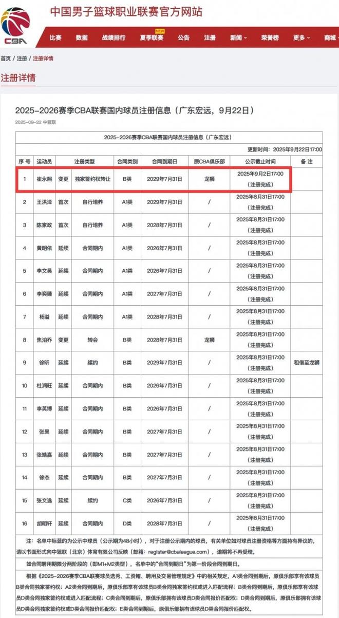 官方:广东与崔永熙签下四年B类合同,网友:朱芳雨算盘打得精今日,CBA官网完成了2025 - 2026赛季CBA联赛国内球员注册信息的更新工作。这一更新吸引了众多球迷和业内人士的关注,因为