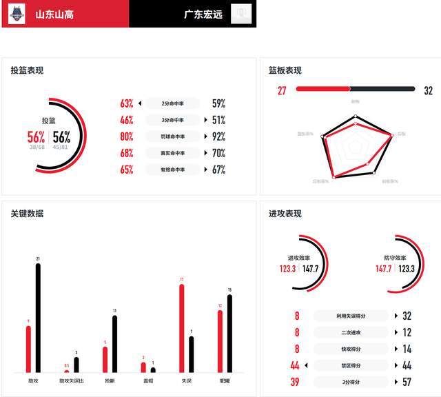 山东队为何输掉了比赛呢?进攻效率并不差,命中率高达56%,和广东队持平。但是,失误太多了,17-7,单单这一项,就被广东队抓住了机会,利用失误得分高达32分。
