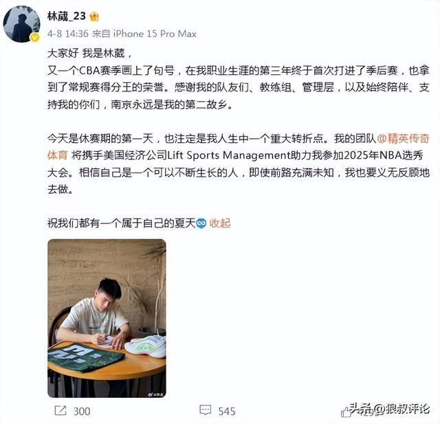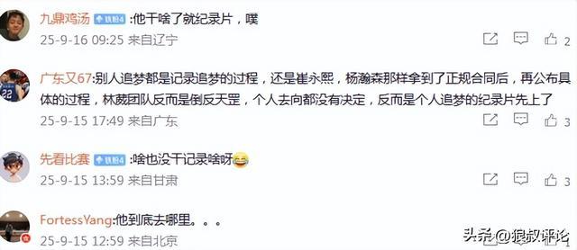 有球迷吐槽说:别人追梦都是记录追梦的过程,还是崔永熙,杨瀚森那样拿到了正规合同后,再公布具体的过程,林葳团队反而是倒反天罡,个人去向都没有决定,反而是个人追梦的纪录片先上了。