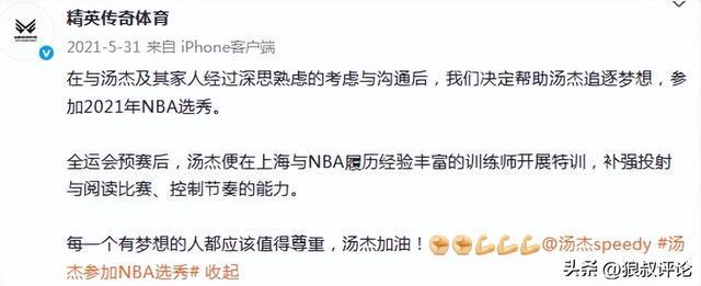 2021年夏天,该经纪公司社媒官宣写道:在与汤杰及其家人经过深思熟虑的考虑与沟通后,我们决定帮助汤杰追逐梦想,参加2021年NBA选秀。
