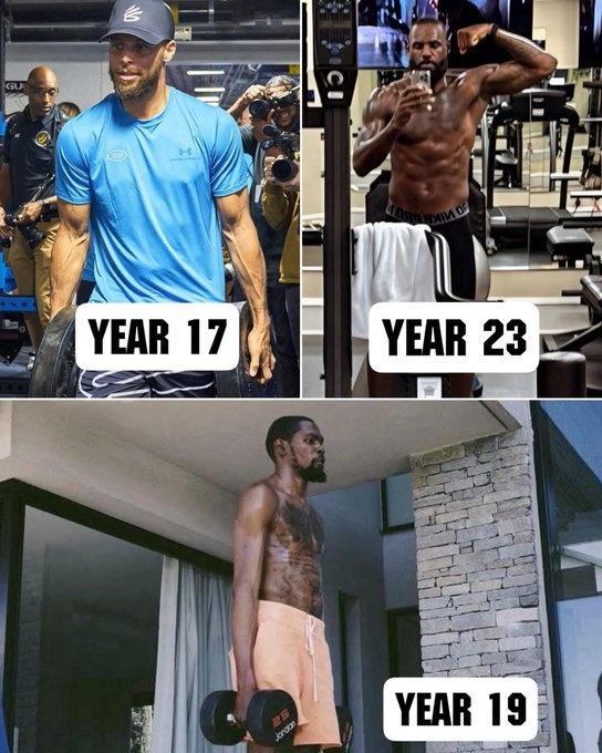 直播吧9月20日讯 美媒NBA Memes今日晒出库里、詹姆斯和杜兰特三人的训练照。NBA Memes调侃写道:“距离新赛季还有一个月,和老詹、库里比起来,杜兰特(的身材)仍像是一位新秀。”库
