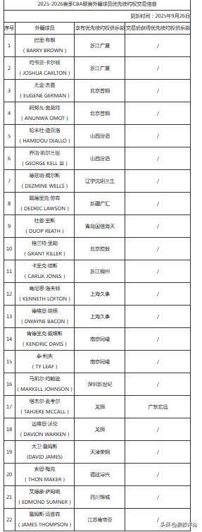 北京时间9月26日,根据CBA官方更新的外援续约名单,除了外界关注的布朗,约克,威尔斯等人之外,萨姆纳的签约权仍在四川男篮,而利夫,迪亚洛,凯尔,梅克等外援已经离开了CBA联赛,大部分的俱乐部仍锁定签约权。