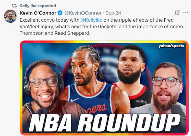 9月24日,雅虎火箭记者凯利-伊科做客NBA记者凯文-奥康纳直播间,这两人都觉得范弗利特赛季报销后这支球队的前景堪忧,一方面球队没有薪金空间完成签约引援,另一方面球队有多位球员