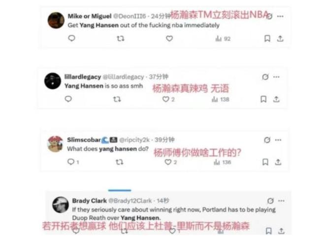 所以我们也看到在比赛进行过程当中,杨瀚森这一幕也引发了很多国外球迷的吐槽和嘲笑。这些球迷认为杨瀚森表现非常的糟糕,根本不知道他在场上是做什么工作的。如果说他要防守贝利,那是不是应该积极一点,而不是直接放手让对方跳投得分的。还有的比较极端的球迷建议杨瀚森直接滚出NBA,不要再留在这里打球。