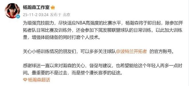 随后,@杨瀚森工作室发布声明:为增强竞技能力,尽快适应NBA高强度的比赛水平,杨瀚森将于即日起,除参加开拓者队日常比赛及训练外,还会参加下属发展联盟球队的日常训练,以此加大训练量,增强体能储备的同时打磨个人技术。