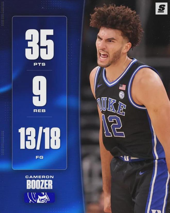 NCAA继续进行,杜克大学80-71战胜阿肯色大学。爵士名宿卡洛斯-布泽尔的儿子卡梅伦-布泽尔再次爆发:18投13中,三分4中2,罚球11中7,狂砍35分9篮板3助攻2抢断。全队得到80分,他一个人拿了35分,这数据可比NBA难。