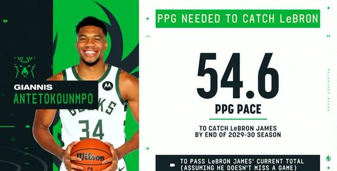 截至目前,NBA的总得分王是詹姆斯,他得到了42250分;而字母哥目前得到了21002分,仅排名第42位。美媒在这一报道后对字母哥的目标进行了计算,假设詹姆斯从现在起不再得分,那么字母哥需要在未来全勤的情况下做到场均54.6分,便能在2029-30赛季的时候超过詹姆斯成为NBA总得分王。