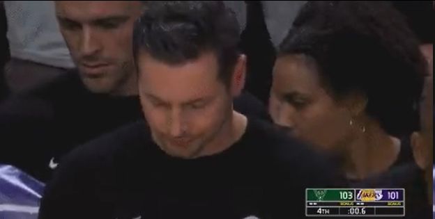 最后一攻发起前,湖人以101-103落后雄鹿两分,詹姆斯当时拿球之后询问雷迪克是否暂停,结果,雷迪克手指向进攻端示意詹姆斯“直接打”。