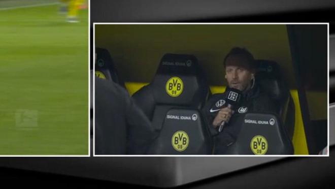 这是德国足球电视报道的一次创新:首次在直播中直接连线坐在替补席的俱乐部高管。德甲联盟(DFL)与各俱乐部协商后,允许更多渠道进入比赛现场,以让足球报道更贴近球迷,同时提供更多视角。