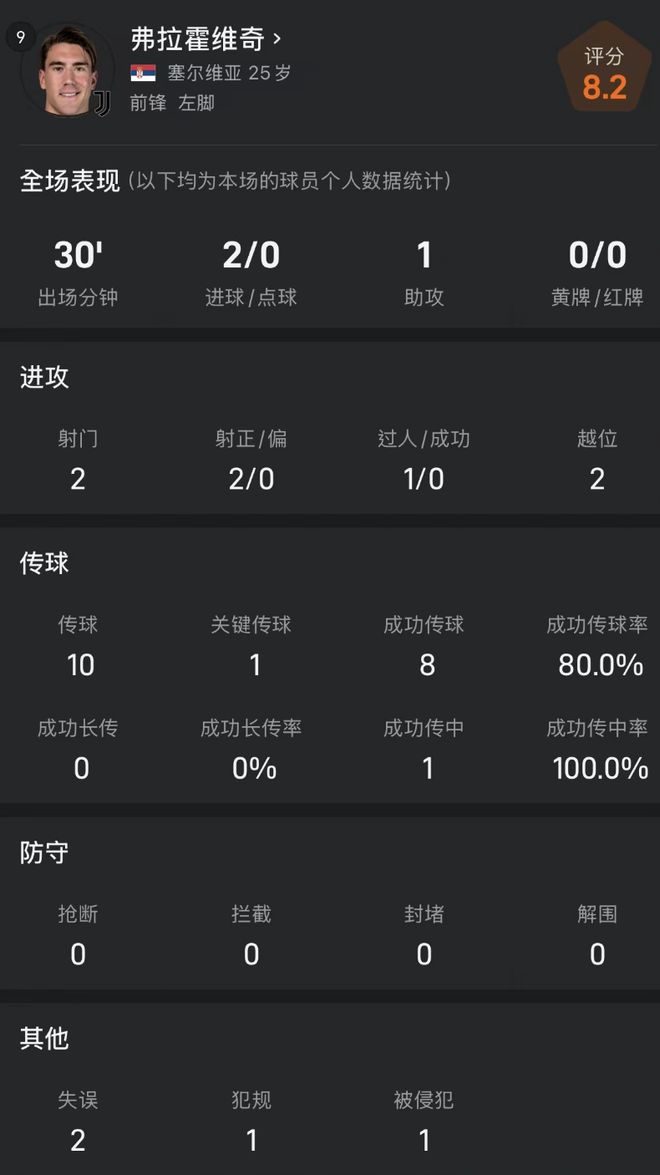比赛过程中,尤文中锋弗拉霍维奇在第60分钟替补登场,打入2球并送出帮助球队绝平的助攻,表现极其出色。