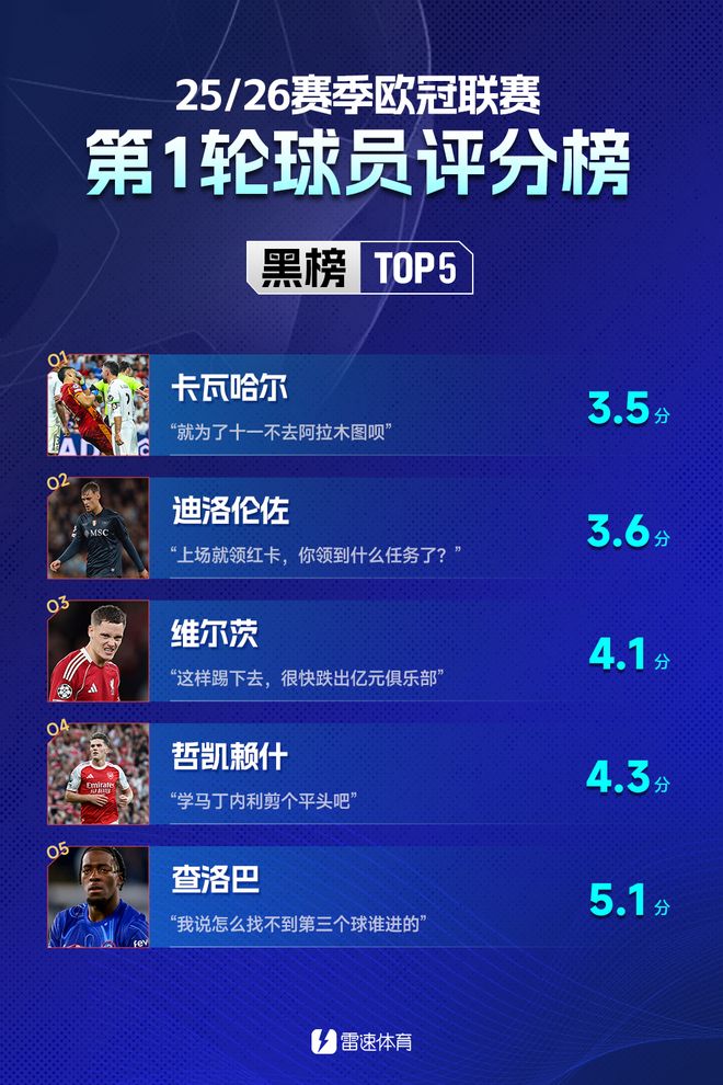 雷速体育9月19日宣 新赛季欧冠联赛阶段结束首轮争夺,36支球队悉数登场,哪些球员给你留下深刻印象?一起来看看雷速体育第一期欧冠红黑榜有哪些球员上榜吧~
