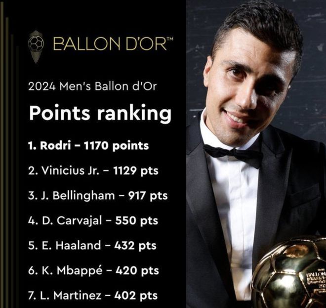 但遗憾的是,皇马队内分票了,拥有欧洲杯冠军、欧洲杯MVP的罗德里当选去年的金球先生。罗德里1170分险胜1129分的维尼修斯,而贝林厄姆则获得917分,卡瓦哈尔550分,排名第3、4位。