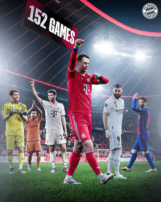 在拜仁公布的海报中,从左至右分别出现了卡西利亚斯、哈维、托马斯·穆勒、诺伊尔、本泽马以及梅西,拜仁官方还配文写道,152场欧冠联赛,诺伊尔排名历史第6名。