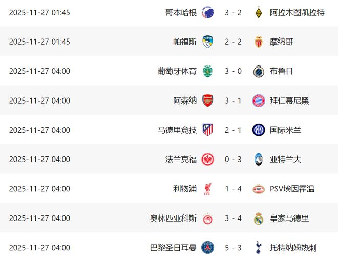 北京时间11月27日凌晨,欧冠联赛阶段第5轮第二个比赛日,包括阿森纳、拜仁、巴黎、皇马、利物浦、国米、马竞等多家豪门悉数出战,上演悲喜一夜。