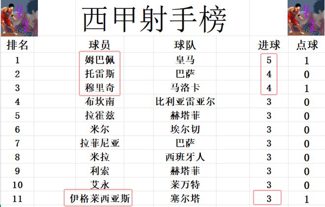 射手榜方面,姆巴佩5球继续领跑,托雷斯今天梅开二度,穆里奇打入绝平一球,两人4球并列第2。伊格莱西亚斯今天打入一球后,追上拉菲尼亚,米尔,布坎南,拉霍兹等人,将前十门槛提高到3球。