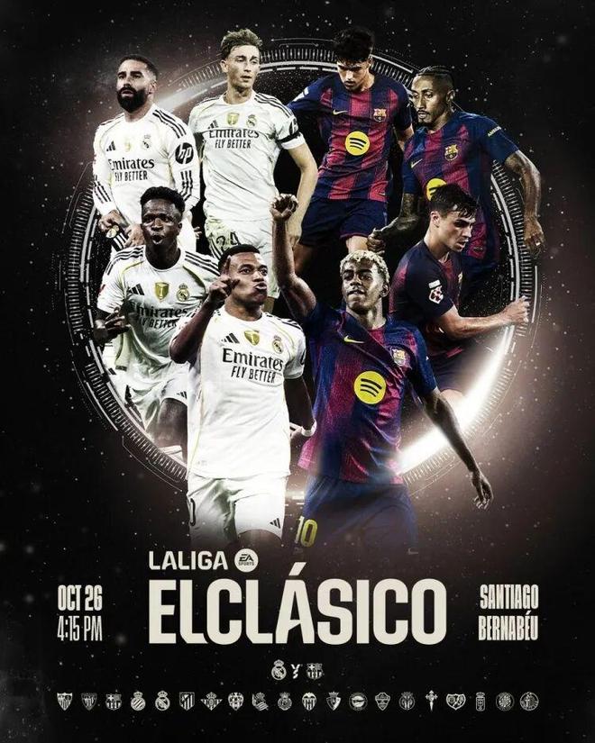 西甲官方社媒晒出海报,确认皇马主场对阵巴萨的西甲第10轮比赛将在10月26日16点15分开球(北京时间23点15分)。