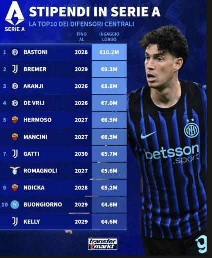意甲中卫税前年薪排行:巴斯托尼1020万欧元居首,前四国米三席