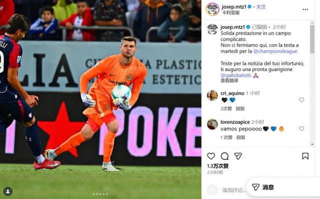 直播吧9月28日宣 本轮意甲比赛,国米在客场以2-0的比分战胜卡利亚里。本场比赛,蓝黑军团门将何塞普-马丁内斯首发登场。在社交媒体上,何塞普-马丁内斯写道:场地条件复杂但我们稳