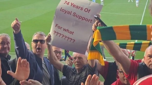卡尼在德比战中举牌抗议:“我坐在这里的时候,你还没出生。”以及“74年忠诚支持——为了什么?”
