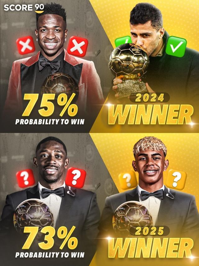 今年会重演吗去年维尼修斯金球75%概率被翻,今年登贝莱概率73%