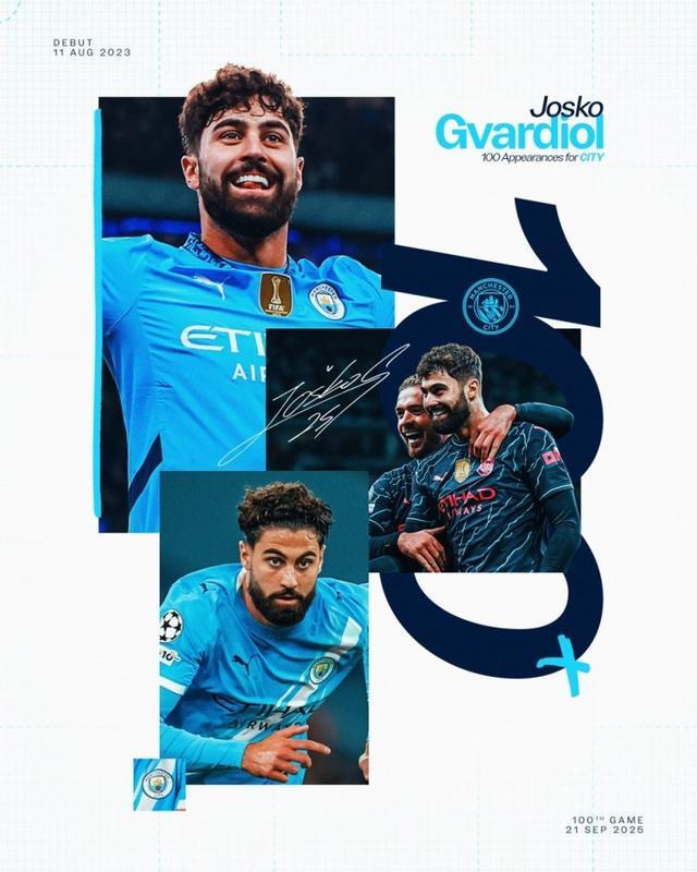 直播吧9月21日宣 英超第5轮,曼城将在客场对阵阿森纳。本场比赛,格瓦迪奥尔迎来曼城百场里程碑。格瓦迪奥尔现年23岁,2023年夏窗以9000万欧转会费从RB莱比锡加盟曼城,共代表蓝月