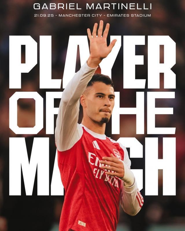 直播吧9月22日宣 英超第5轮比赛,阿森纳主场1-1战平曼城。此役马丁内利替补出场,补时阶段攻入绝平进球,阿森纳官方宣布,他当选本场比赛阿森纳队内最佳球员。独家看英超就在咪咕