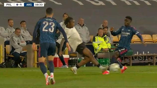 直播吧09月25日宣 联赛杯第3轮,阿森纳客战英甲球队维尔港。50分钟,萨卡被对方球员蹬踏,痛苦倒地。缓了一会儿,萨卡继续比赛。独家看英超就在咪咕