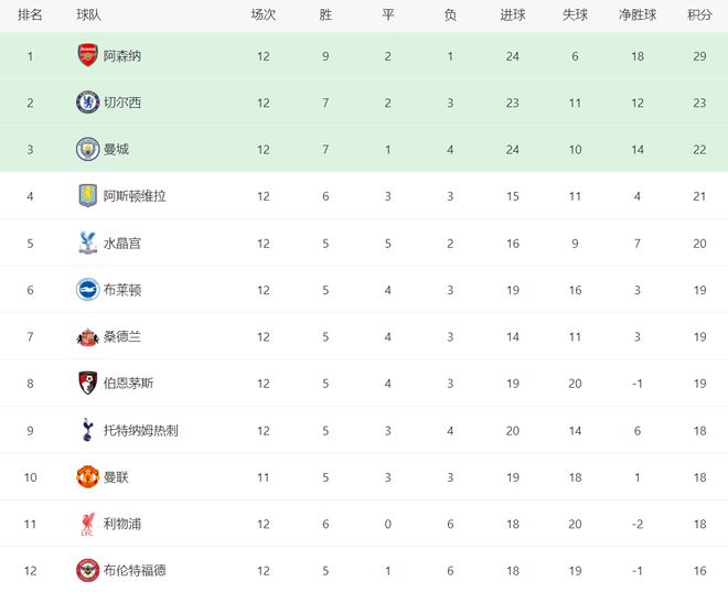 本赛季英超第12轮基本结束,只剩下曼联VS埃弗顿的比赛,但不影响积分榜的整体排名。领头羊阿森纳主场4-1大胜热刺之后,将领跑优势扩大到6分,切尔西、曼城分列第二、第三,卫冕冠军利