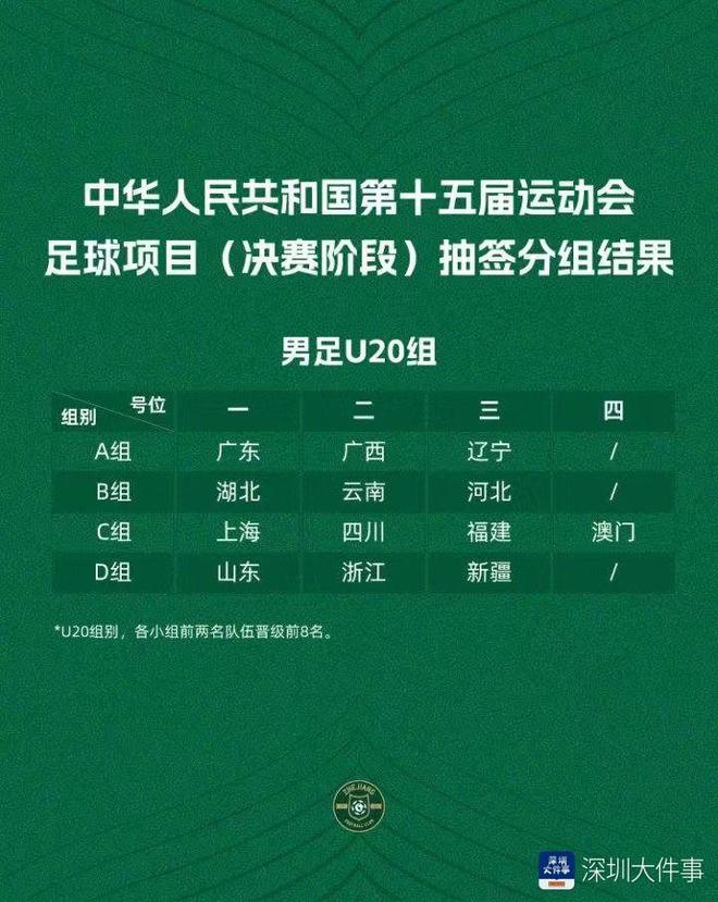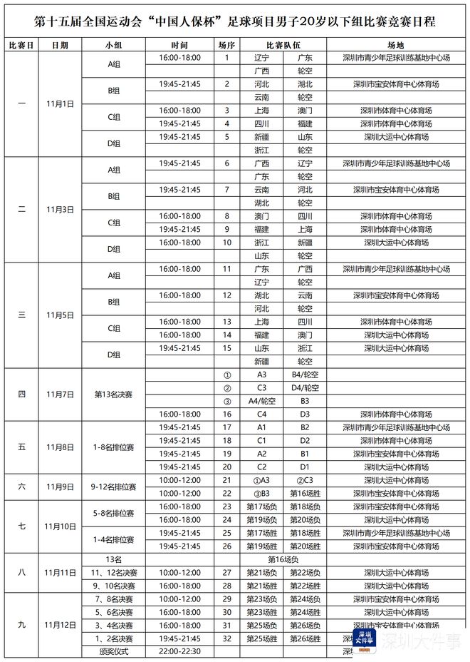11月1日至12日,本届全运会男足U20赛事将在深圳赛区进行。比赛共有13支队伍参赛,分为4个小组,小组赛采用单循环赛制,各小组前两名进入8强进行淘汰赛,其余队伍则进行第9-13名排位赛。